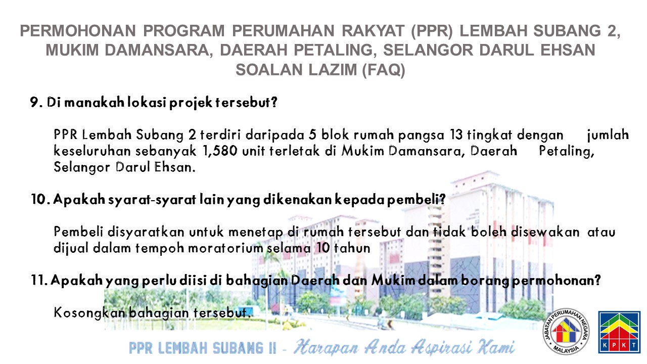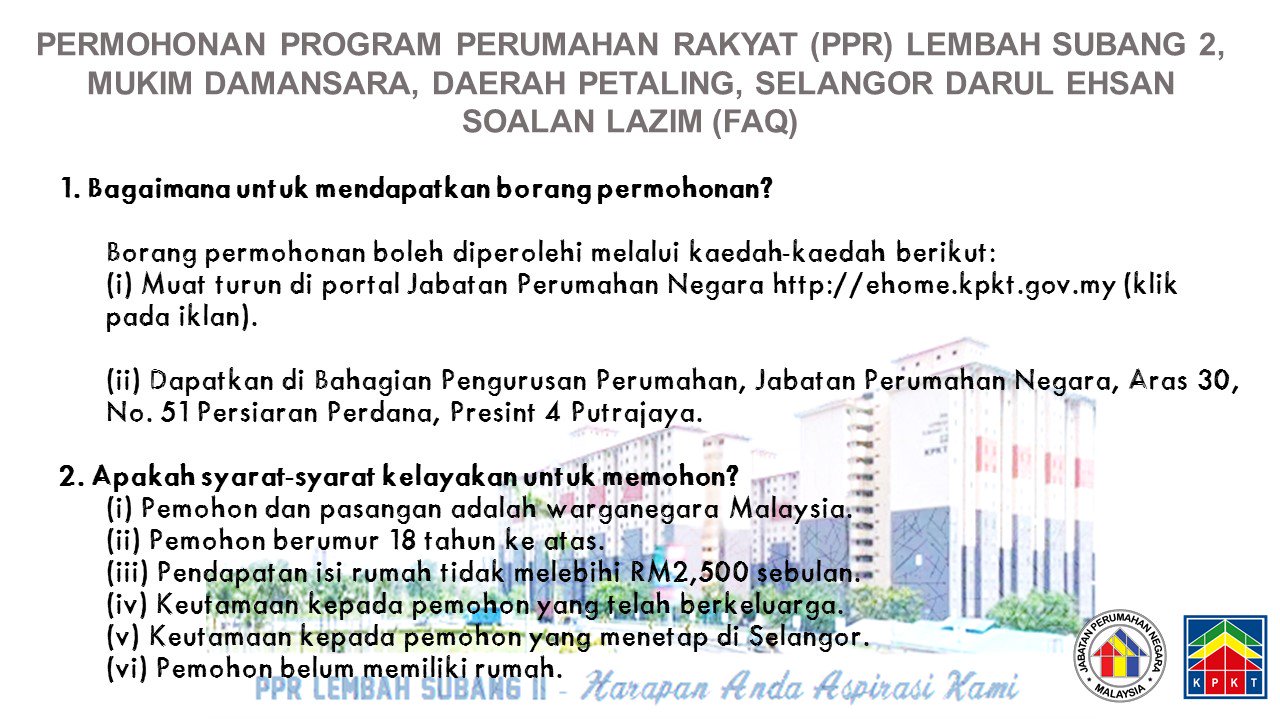 Sebelum buat permohonan anda mesti tahu syaratnya terlebih dahulu, beberapa syarat ditetapkan bagi program ini dimana ianya. Program kerajaan untuk penempatan kos rendah ini amat menggalakkan penyertaan golongan yang berpendapatan kurang dari rm 2,500 sebulan. Ppr yang terlibat adalah ppr sentul murni, rumah transit bukit jalil, ppr lembah subang 1, ppr lembah subang 2, ppr kampung hassan hulu selangor, ppr ladang siliau port dickson, ppr tok suboh, ppr amanjaya, ppr kota setar, ppr sinar intan 3, ppr gua musang dan ppr kota bahru. Program pemilikan rumah lembah subang ii. Sebenarnya ada dua kawasan rumah yang berdekatan dengan masjid subang airport.