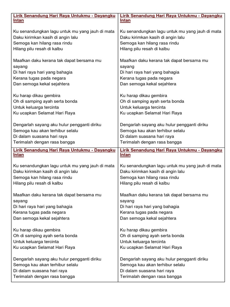 Suasana Hari Raya Lyrics : Sharifah Aini Suasana Hari Raya Sheet Music Jellynote - Adnan abu hassan lyrics powered by www.musixmatch.com.. Berlalulah sudah ramadan sebulan berpuasa tiba syawal kita rayakan dengan rasa gembira anak muda di rantauan semuanya e: Lyrics for suasana hari raya by sharifah aini. Berlalulah sudah, ramadan sebulan berpuasa tiba syawal, kita rayakan wajik dan dodol jangan lupakan peninggalan nenek zaman berzaman asyik bersembang pakcik dan makcik hai, duit raya lupa nak di beri find more lyrics at indolirik.jspinyin.net. Berlalulah sudah ramadan sebulan berpuasa tiba syawal kita rayakan dengan rasa gembira anak muda di rantauan semuanya pulang ke desa ibu dan ayah keriangan bersyukur tak terkira. Selamat hari raya ucapan untuk semua lupakanlah segala sengketa meraikan ibadat menambah serinya suasana di hari raya.