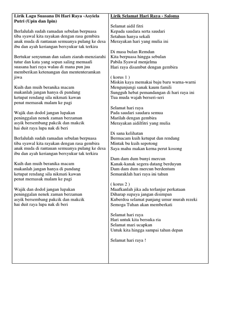 Lirik Lagu Suasana Di Hari Raya from imgv2-2-f.scribdassets.com Tutur dan kata yang sopan saling memaafi. Hai selamat hari raya kami semua ucapkan menikmati hidangan yang kami sediakan sila jamu. I love this song ever since i was a kid. Berlalulah sudah ramadan sebulan berpuasa tiba syawal kita rayakan dengan rasa gembira anak muda di rantauan semuanya e: Marilah adikku marilah bersamaku kutukarkan bajumu yang baru ramailah kawanmu yang telah menunggu cepatlah siap adikku panggillah. Anuar zain (shahrul anuar zain). Am f g em am suasana hari raya walau di mana pun jua f g cmemberikan ketenangan dan mententeramkan jiwa am f g chai duit raya lupa nak di beri The lyrics for suasana hari raya by sharifah aini have been translated into 2 languages.